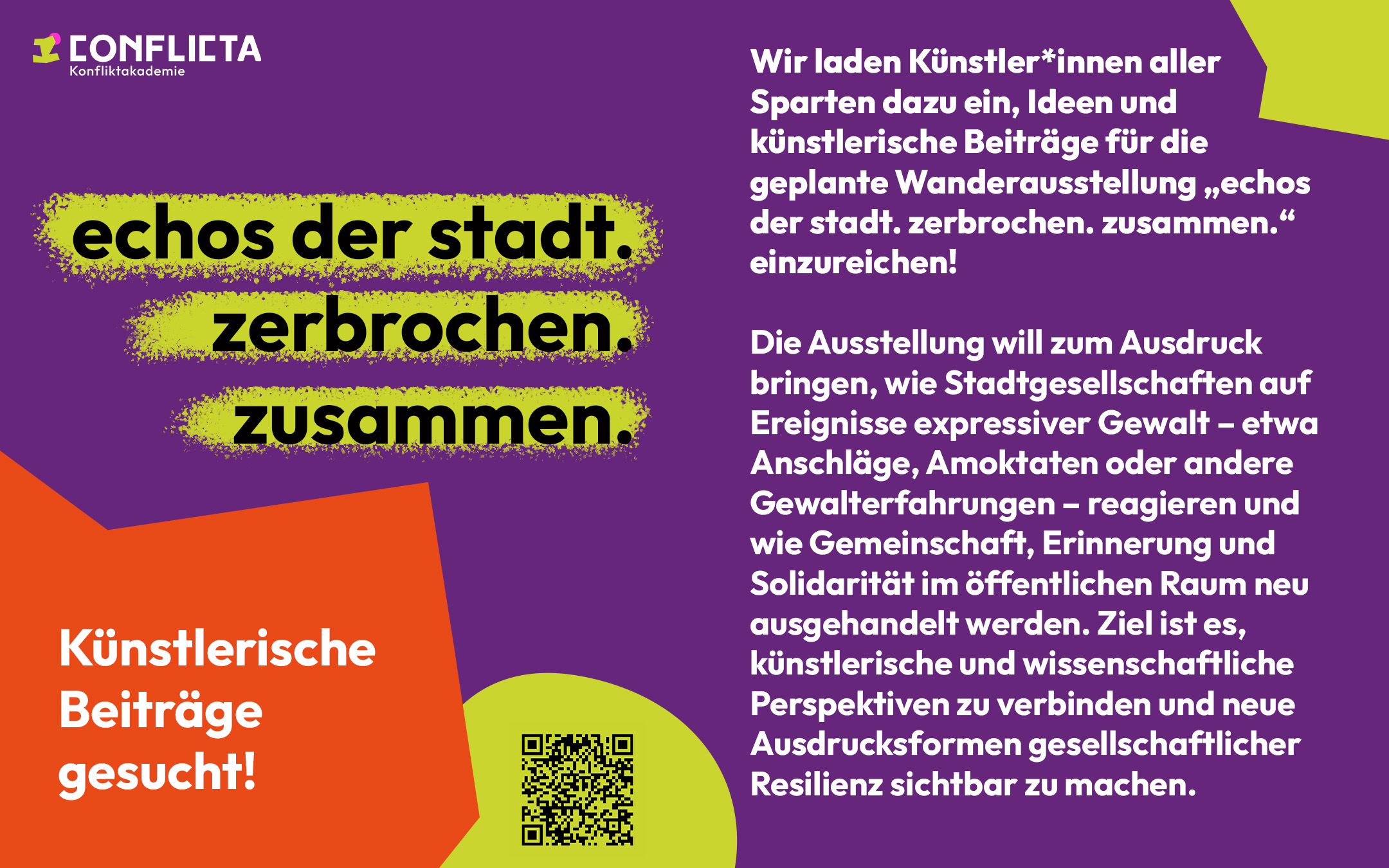 Die Konfliktakademie ConflictA lädt Künstler*innen aller Sparten dazu ein, Ideen und künstlerische Beiträge für die geplante Wanderausstellung „echos der stadt. zerbrochen. zusammen.“ einzureichen.