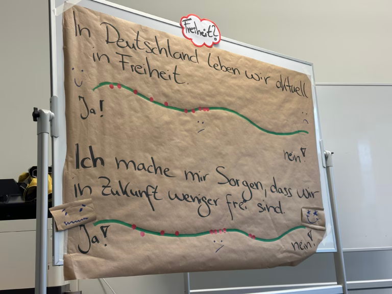 Direkt zu Anfang wurde es dementsprechend philosophisch. Freiheit wurde u.a. mit Gefühlen, dem Gesundheitsstatus einer Person, der eigenen Wahrnehmung und des jeweiligen Verständnisses von Leben verbunden. „Menschen können freier sein, wenn sie keine Normen erfüllen müssen.‘‘ lautet hier bspw. ein schriftlicher Beitrag. Es gab zudem Stimmen, die Freiheit als eine Art Grundsicherung in einem demokratischen, staatlichen Gefüge definieren – ,,Menschen sind frei, weil Gesetze sie schützen.‘‘