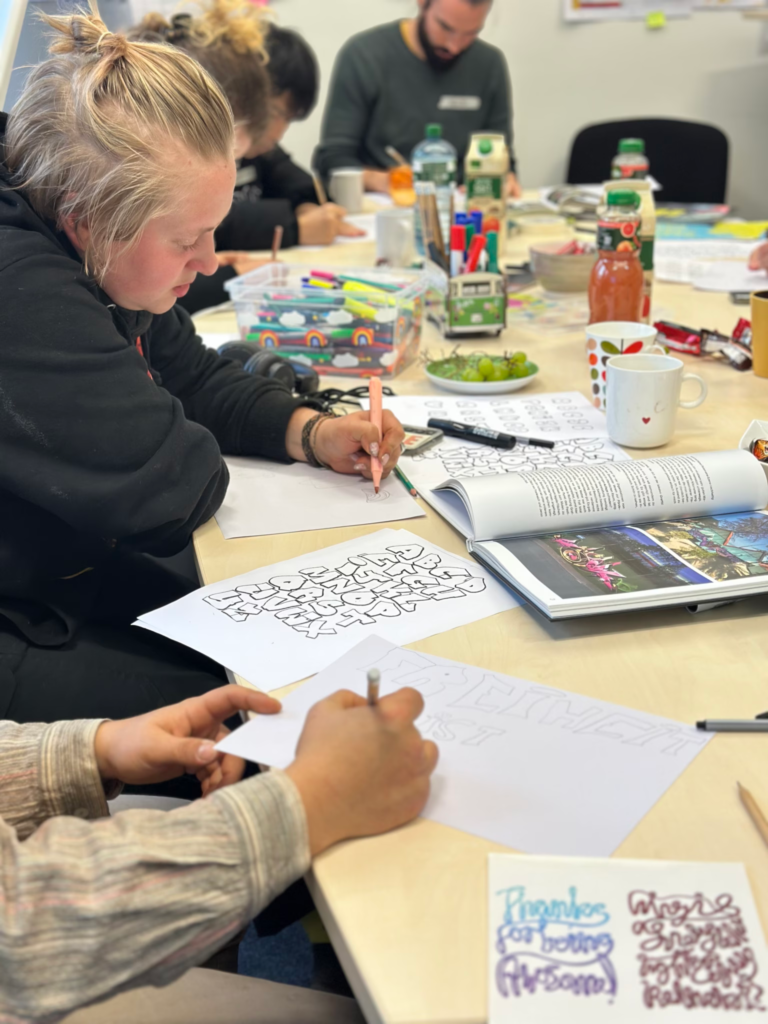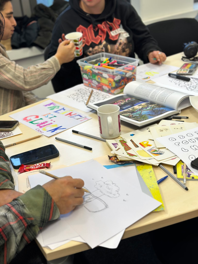 Anschließend fokussierten wir die eigenen Kunstwerke, die im Laufe des Wochenendes entstehen sollten. Die Künstlerin MARLA gab eine kleine Einführung in die Geschichte des Graffiti und verteilte Bildbände sowie erste Vorlagen.